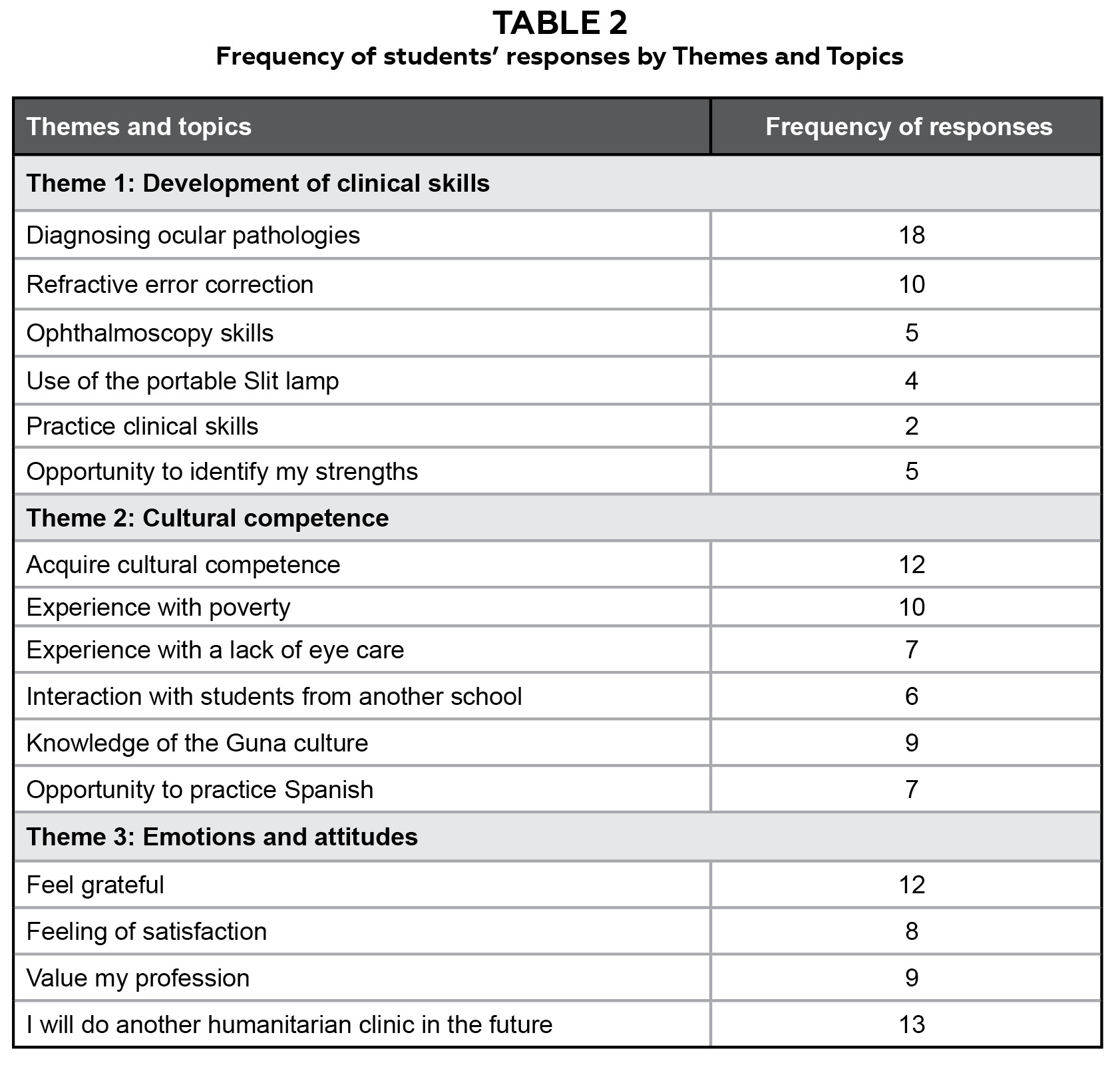 The essays from all 12 students indicated that the experience with the Guna Nega community enhanced their overall clinical skills and improved their diagnosis of ocular pathologies (Table 2).