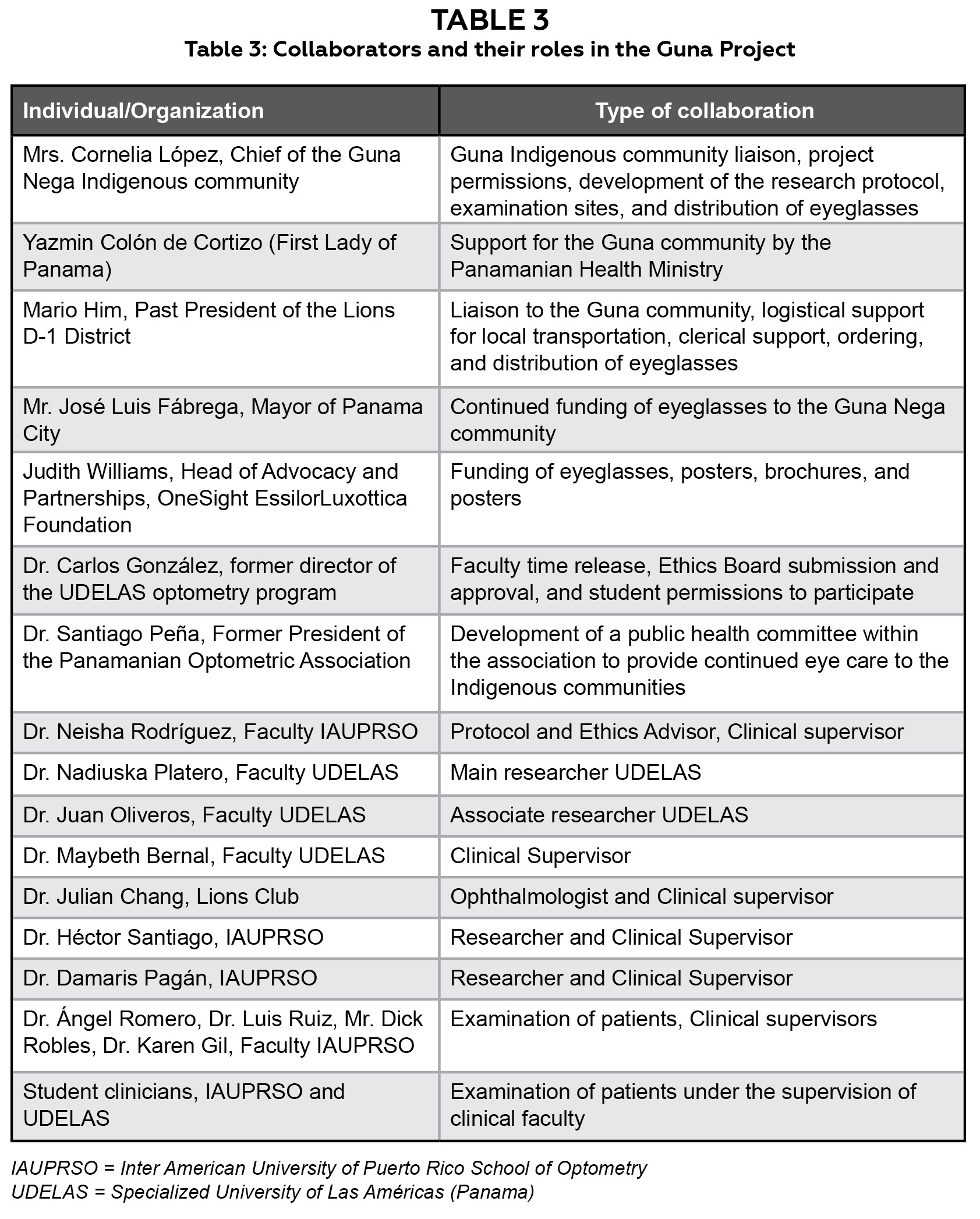 As reported in the literature, the success of collaborative work between academics and non-academics depends on frequent communication of the project’s objectives.21 For example, while the Guna community leader and the Lions Club’s partners wanted a large number of patients to be examined daily, we made it clear that the project’s goal was not only to provide eyecare services to the Gunas, but also to serve as a teaching and research clinic. For that reason, we limited the number of patients per day to be able to provide comprehensive examinations and reliable data collection using a strict protocol. The collaborative nature of the project was significantly enhanced because several optometrists were already members of VOSH/International and Lions Clubs International. These two leading non-governmental organizations (NGOs) share a common mission of providing eye care to disadvantaged populations, and this mutual understanding fostered clear and accessible communication between the optometrists and the organizations’ members.21