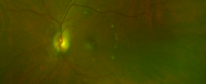 Given the lack of anterior segment findings correlating with the reported eye scratch and decreased vision, the pupils were dilated for further assessment. On dilated fundus exam, the cup to disc ratio measured 0.35 horizontally and vertically, and the optic nerves were pink and healthy without disc edema OU. In the macula OD, a large central yellow deposit and a separate yellow deposit inferior temporal to the optic nerve were noted (Figure 1A). OS, a small central yellow deposit in the macula and multiple yellow deposits in a 360-degree ring-like formation were noted (Figure 1B). There were no appreciable clinical signs of subretinal fluid or hemorrhages on funduscopic exam. The retinal periphery was intact 360 degrees without retinal holes, breaks or detachments OU. A presumed stable inactive toxoplasmosis scar was noted nasally OD.