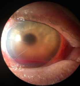 ![]() Figure 1. External photo of the right eye at initial presentation: A 1.5-mm hyphema is visible in the inferior anterior chamber, and 3+ flare is obscuring the view of the pupil. The cornea has stable radial keratotomy scars with visible endothelial red blood cell staining on the inferior half. The conjunctiva has significant hyperemia. Eyelids and eyelashes are unremarkable. |