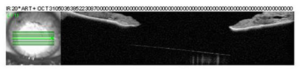 ![]() Figure 3a. Anterior segment OCT of the right eye on day 13: The anterior aspect of the PCIOL is apposed to the posterior iris with significant interaction at the pupil margin. |
