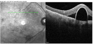 Figure 1. Optical coherence tomography scan and gray-scale image of pigment epithelial detachment with surrounding subretinal fluid in the right eye.