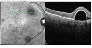 Although asymptomatic patients with PED that spares the fovea can be monitored without treatment, the retinal specialist consulted in this case recommended a monthly series of anti-VEGF injections for the right eye due to the associated SRF. The presence of SRF was suggestive of underlying RPE decompensation that allowed fluid entry into subsensory space, which placed the patient at higher risk for visual compromise.10 Consequently, he was treated at his first and second follow-up visits, after which SRF in the right eye nearly completely resolved (Figure 4). The underlying PED also exhibited a reduction in height. During his last scheduled injection appointment, however, recurrence of SRF over the superior PED was noted (Figure 5). Given re-emergence of SRF, the patient’s treatment schedule was altered from an original treat-and-extend regimen, which would have lengthened follow-up intervals to longer than one month, to two additional monthly injection visits.