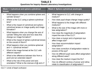There are many possible approaches to the design and execution of learning activities in the laboratory setting. There is a long history of laboratory use in science education, which is believed to provide students with valuable experiences with science concepts and the processes required in scientific fields. An inquiry-based laboratory is one way to increase the depth of conceptual and quantitative understanding and stimulate critical-thinking.10-18 Here, inquiry refers to the fact that students learn process skills relevant to optometric practice, such as problem-solving, data analysis and communication, along with the content centered on the concepts of sphero-cylindrical ametropia. Traditional laboratories on the other hand can be any hands-on activity outside a lecture setting where students work to visualize information. They can provide a hands-on and active experience with the material, but in a traditional lab, learners are typically following a set, clearly defined procedure to simply observe and record findings. This could include activities with physical materials or computer simulations that often at least appear to have a “right” answer with errors attributed to malfunction or human error. The learning goals for traditional laboratories are typically content-driven rather than process-driven.19-24 Traditional lectures and laboratories are widely accepted as effective methods to deliver basic content to students and have a long history of use in scientific education. A comparison between the two methods is presented in Table 2.