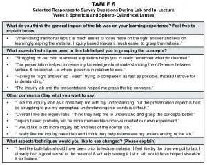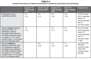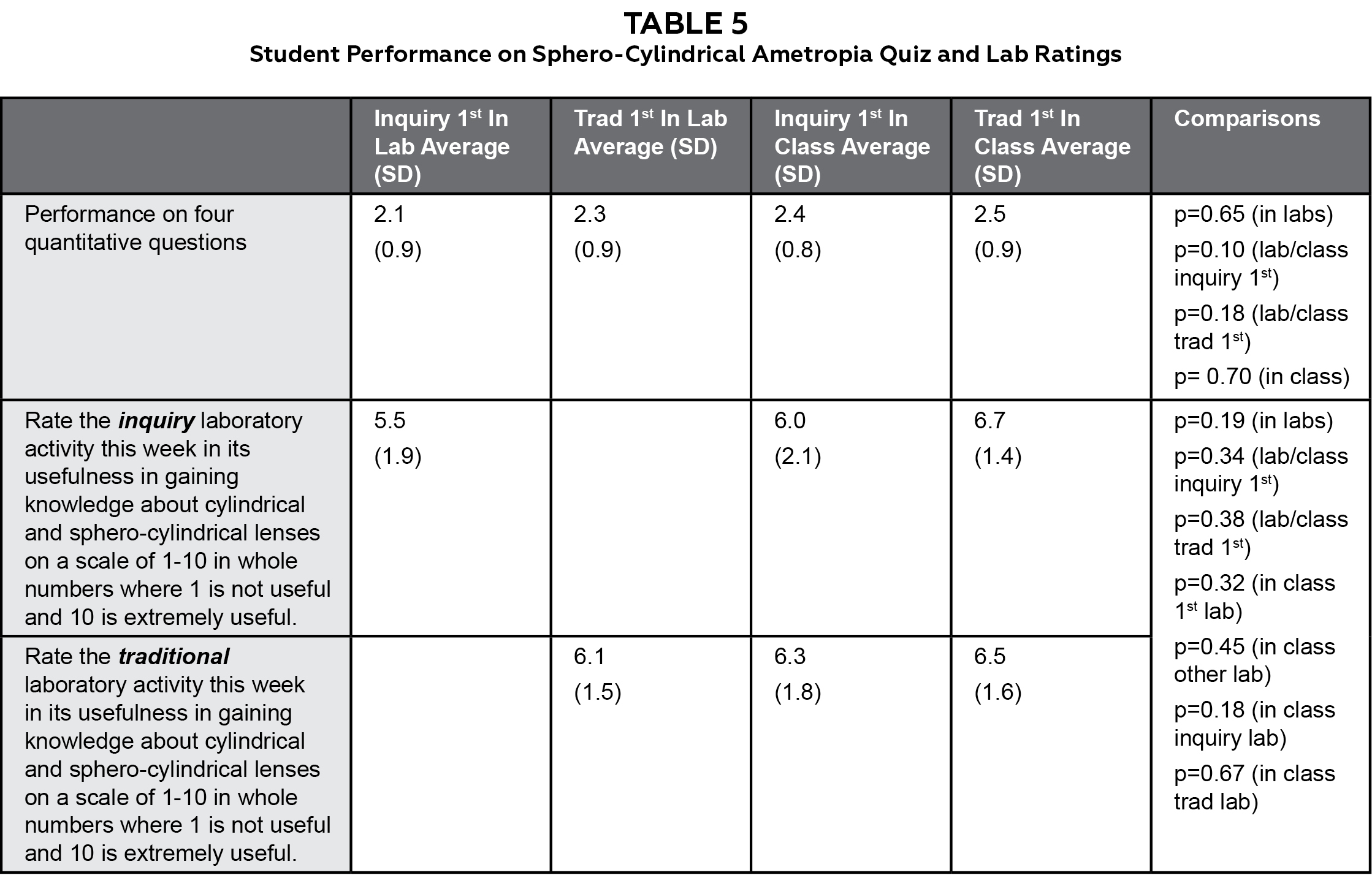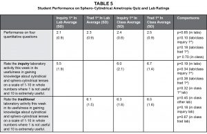 During the first week’s spherical and sphero-cylindrical lenses laboratories, 56 students completed a quiz and survey in lab immediately after either the inquiry-based lab (27) or the traditional lab (29). 52 students completed the quiz and survey in the next lecture. Results comparing performance on the four quantitative questions revealed no significant differences. Results comparing student ratings of the labs in their usefulness in gaining knowledge about cylindrical and sphero-cylindrical lenses on a scale of 1-10 in whole numbers where 1 is not useful and 10 is extremely useful also revealed no significant differences. These results are in Table 4. During the second week’s sphero-cylindrical ametropia laboratories, 56 students completed a quiz and survey in lab immediately after either the inquiry-based lab (29) or the traditional lab (27). Fifty-five students completed the quiz and survey in the next lecture. Results comparing performance on the four quantitative questions and the questions asking students to rate the labs are presented in Table 5. There was again some variability, but no significant differences.