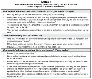 As discussed in the methods section, the survey included some open-ended questions. The responses to these questions highlighted the value of the diverse laboratory experiences. Selected responses are in Table 6 and Table 7. In addition to the comments in the tables, numerous comments indicated the students would like more time; some felt they had to rush. This limitation of this first administration is addressed in the discussion section. Numerous comments highlighted that the students felt the traditional lab should take place before the inquiry-based lab, and many students requested more guidance.