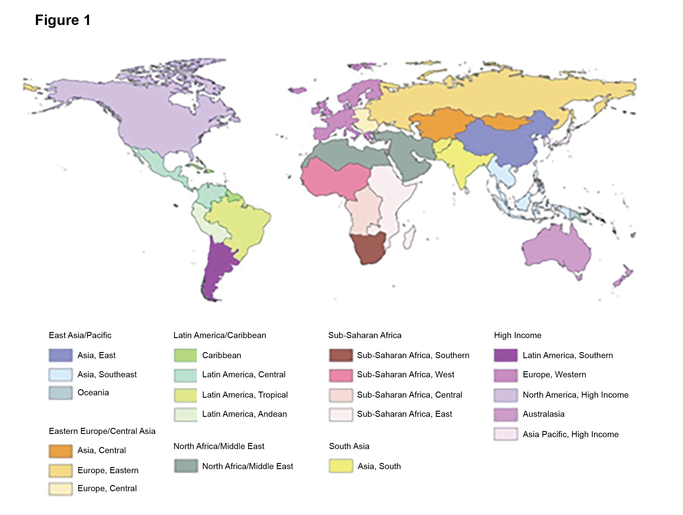 Figure 1:Figure 1 Map of the 21 GBD regions.Source: https://www.researchgate.net/figure/Map-of-the-21-GBD-regions-GBD-Global-Burden-of-Disease-Risk-Factors-and-Injuries_fig1_233955589. Click to enlarge