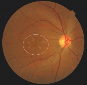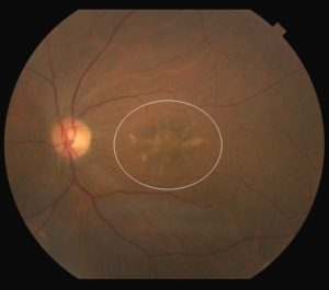 ![]() Figure 3. 2017: Mydriatic fundus photography of the posterior pole of the right eye, including optic nerve, macula and major retinal vessels. The area of butterfly-shaped pattern dystrophy is circled. |