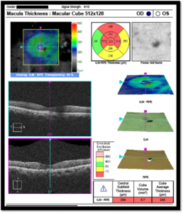 The patient was scheduled to return in one year for a comprehensive exam with OCT imaging of the maculae and fundus photographs of both eyes. The plan included continued progression analysis of macular thickness via OCT scans and to obtain baseline fundus autofluorescence imaging. Obtaining an electroretinogram (ERG) and electro-oculogram (EOG) could also be illustrative. In pattern dystrophies, expected findings would be abnormal pattern ERG, normal flash ERG and abnormal EOG.10