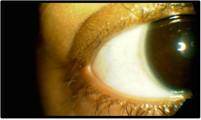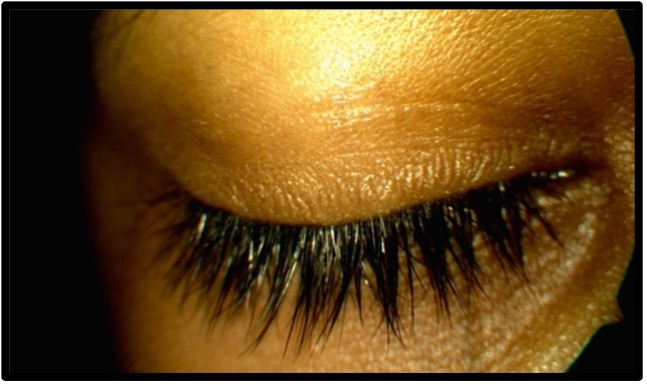 A 10-year-old Indian female presented to the pediatric eye clinic at a city hospital complaining of loss of eyelashes and “severe eyelid itching” for the past 2 months. Her ocular history included mild refractive amblyopia secondary to high hyperopic astigmatism in the right eye. She wears bifocal glasses with full distance correction with an add to improve her esophoric posture at near. She also has a history of mild dry eye syndrome and mild anterior and posterior blepharitis in both eyes, which was being treated with artificial tears, warm compresses and lid hygiene, with fair compliance. There was no history of allergic conjunctivitis. Her dilated fundus examination had historically been unremarkable in both eyes.