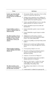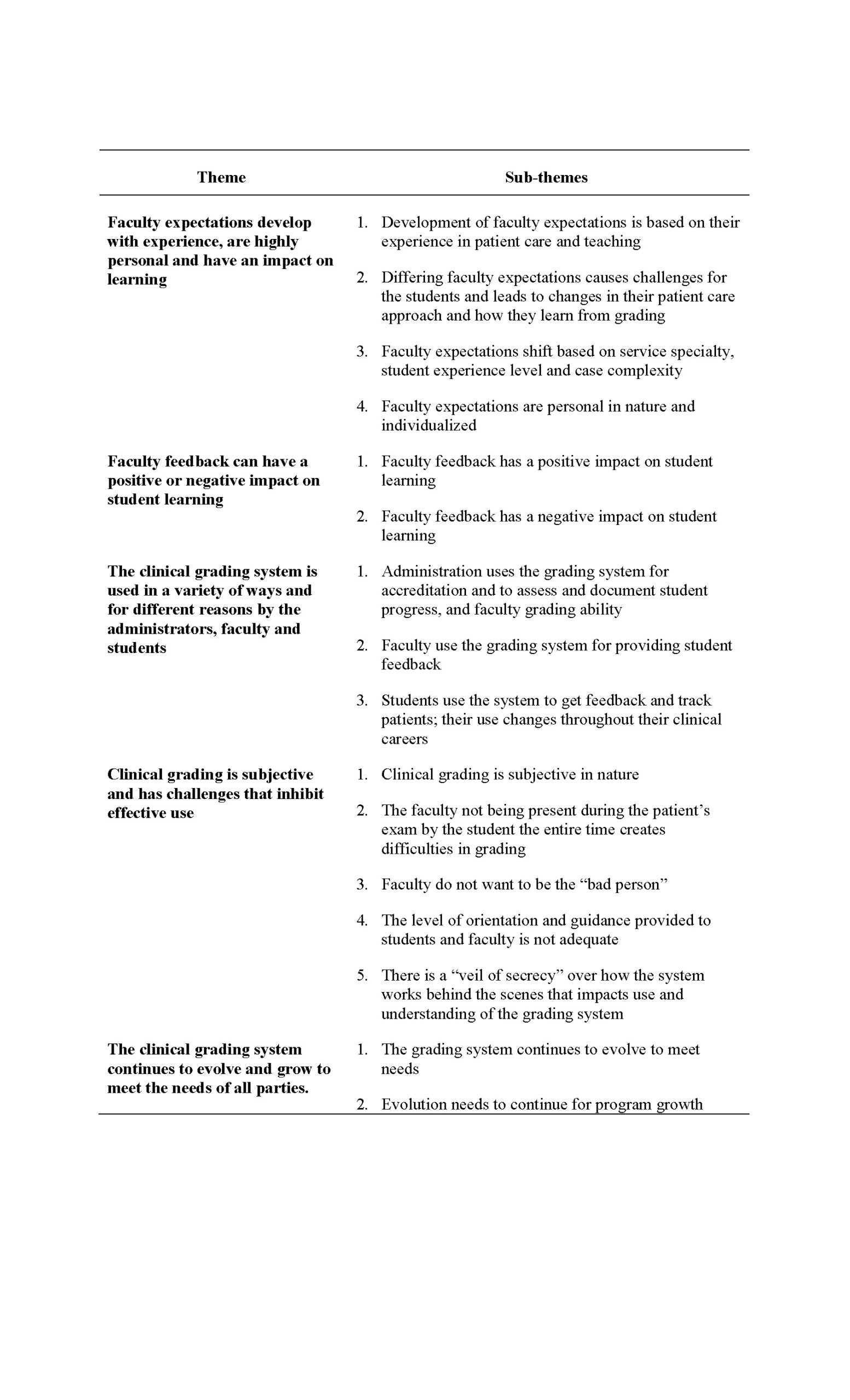 Results: Five themes developed: (1) Faculty expectations develop with experience, are highly personal, and have an impact on learning; (2) Faculty feedback can have a positive or negative impact on student learning; (3) The clinical grading system is used in a variety of ways and for different reasons by the faculty, administrators, and students; (4) Clinical grading is subjective and has challenges that inhibit its effective use; and (5) The clinical grading system continues to evolve and grow to meet the needs of all parties.