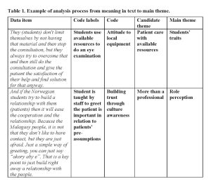 The meaning of the text, data item, was discussed and agreed upon by researchers. The code labels are the first phase in identifying segments of text, identified as interesting, relevant and meaningful.19 The code phase is the more latent step to develop candidate themes. The authors reflected between each step, to ensure that meaningful interpretation was conducted. The main themes were defined after a dynamic process of analysis. Table 1 presents the process of interpretation on how Malagasy staff members describe students’ traits and their role guiding students beyond health professional responsibilities. Informants were not a part of the analysis team.
