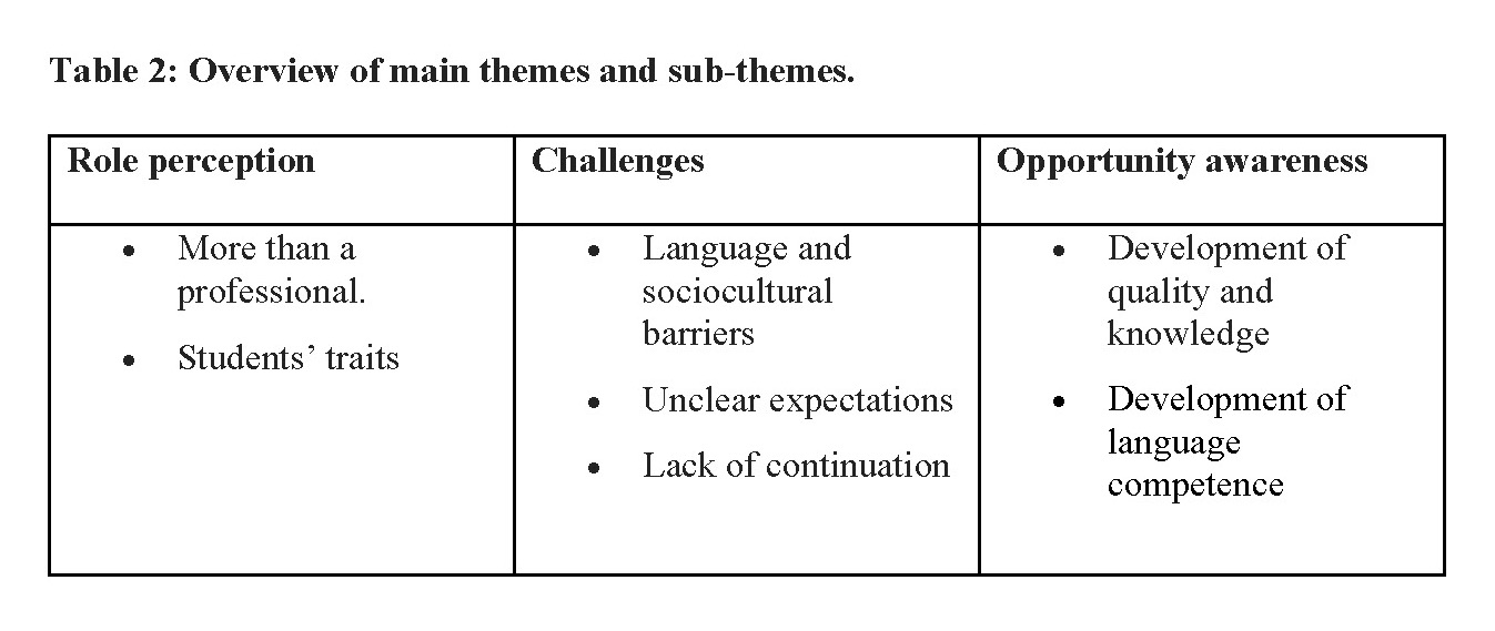 Role perception refers to how the informants define their role. This concept includes two sub-themes: More Than a Professional and Students’ Traits.