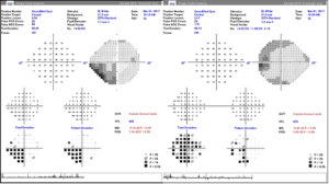 The patient had previously been diagnosed with pigment dispersion glaucoma and associated transillumination defects. He had thinner than average corneas with corneal pachymetry measurements of 536 µm in the right eye and 529 µm in the left eye. Eyes with thinner corneas are known to have intraocular pressure (IOP) underestimated by 2-5 mmHg by applanation tonometry. Optical coherence tomography (OCT) showed significant thinning of the retinal nerve fiber layer in the superior-temporal and inferior-temporal sectors of both eyes. Asymmetrical cupping of the optic discs was observed. These tests were repeated as was a Humphrey 24-2 full-threshold visual field test. The results from the visual field test did not correlate with the OCT findings. Instead, there was a consistent yet progressing left incongruous homonymous visual field defect, indicating a possible neurological condition (Figure 1).