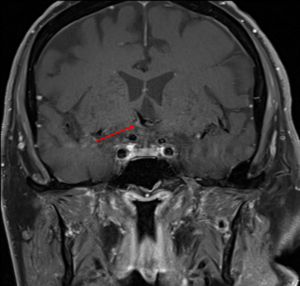 ![]() Figure 2. MRI of the dolichoectatic anterior cerebral arteries compressing the optic chiasm. Click to enlarge |