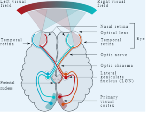 Figure 4. The primary visual pathway (solid lines). Source: Miquel Perello Nieto, CC BY-SA 4.0, via Wikimedia Commons. Click to enlarge