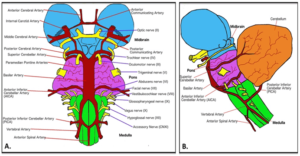 Figure 5. Brainstem vasculature and emerging cranial nerves. Source: Cuoco et al., Creative Commons Attribution 4.0 International License, via Edorium Journal of Neurology.15 Click to enlarge
