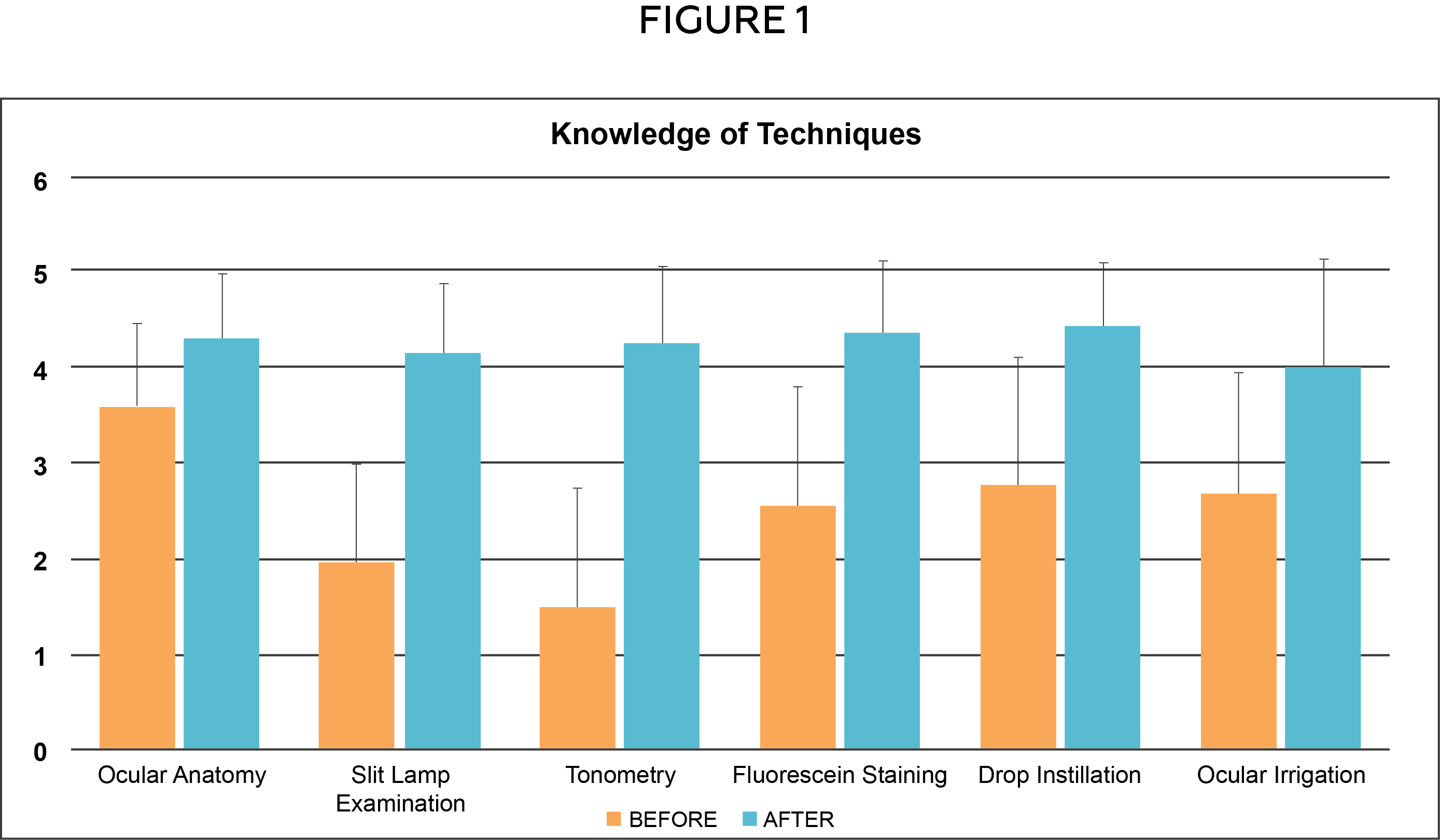 The reported amount of knowledge and experience increased in all categories after the workshop. The post-workshop experience and knowledge in ocular irrigation had a slightly lower result compared with the other tests. This can be attributed to the fact that in one session the lecture portion covering this material was not completed due to time constraints. In several sessions some of the students reported that they ran out of practice time for this technique. The higher results also indicate that the lecture coverage of the materials provided a thorough understanding of the topics. The hands-on workshop gave participants enough experience to feel more comfortable with performing techniques. This anecdotal response does not ensure proper or safe technique. A traditional proficiency-style practical exam or requirement to perform the technique a given amount of times under supervision may be better options.