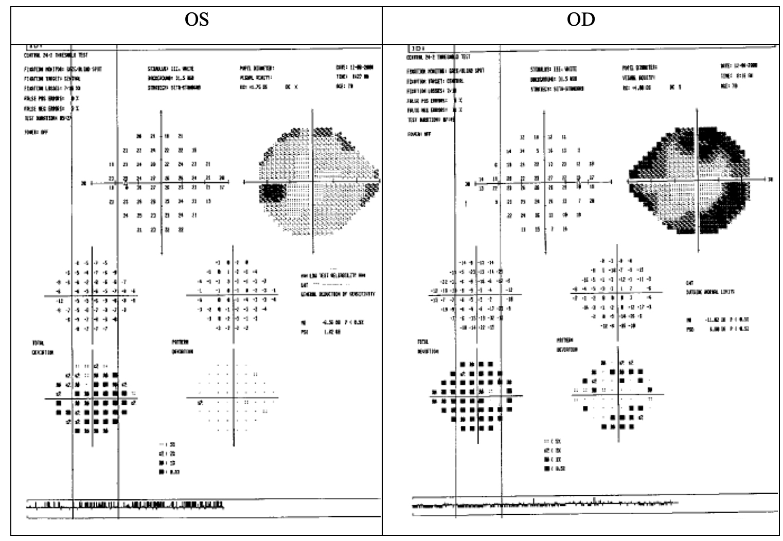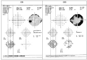 Patient AB returned 2 weeks later for a repeat threshold visual field examination, optical coherence tomography of the retinal nerve fiber layer and optic nerve, intraocular pressure check, pachymetry and gonioscopy. He reported no changes in vision or ocular discomfort. His corrected visual acuity remained stable at 20/30 in the right eye, with no improvement with pinhole acuities in the left eye. Pupils were round and reactive to light and no afferent pupil defect was noted in both eyes. Extraocular muscles were unrestricted in all gazes.