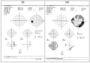 Given the patient’s eagerness to further evaluate for primary open angle glaucoma, a Humphrey visual field 24-2 SITA-FAST was completed, demonstrating borderline reliability with a possible moderate incomplete superior and inferior arcuate (versus a possible cloverleaf defect due to challenges with patient attention) in the right eye (MD -11.02dB) and non-optimal reliability but no pattern defects in the left eye (MD -6.56dB). Results are available below in Figure 1.