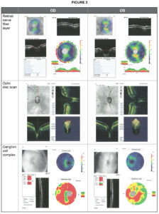 Optical coherence tomography (OCT) was performed at this visit. As viewed in Figure 3 from the RTVue Fourier-Domain OCT System, imaging of Patient AB’s retinal nerve fiber layer was completed.