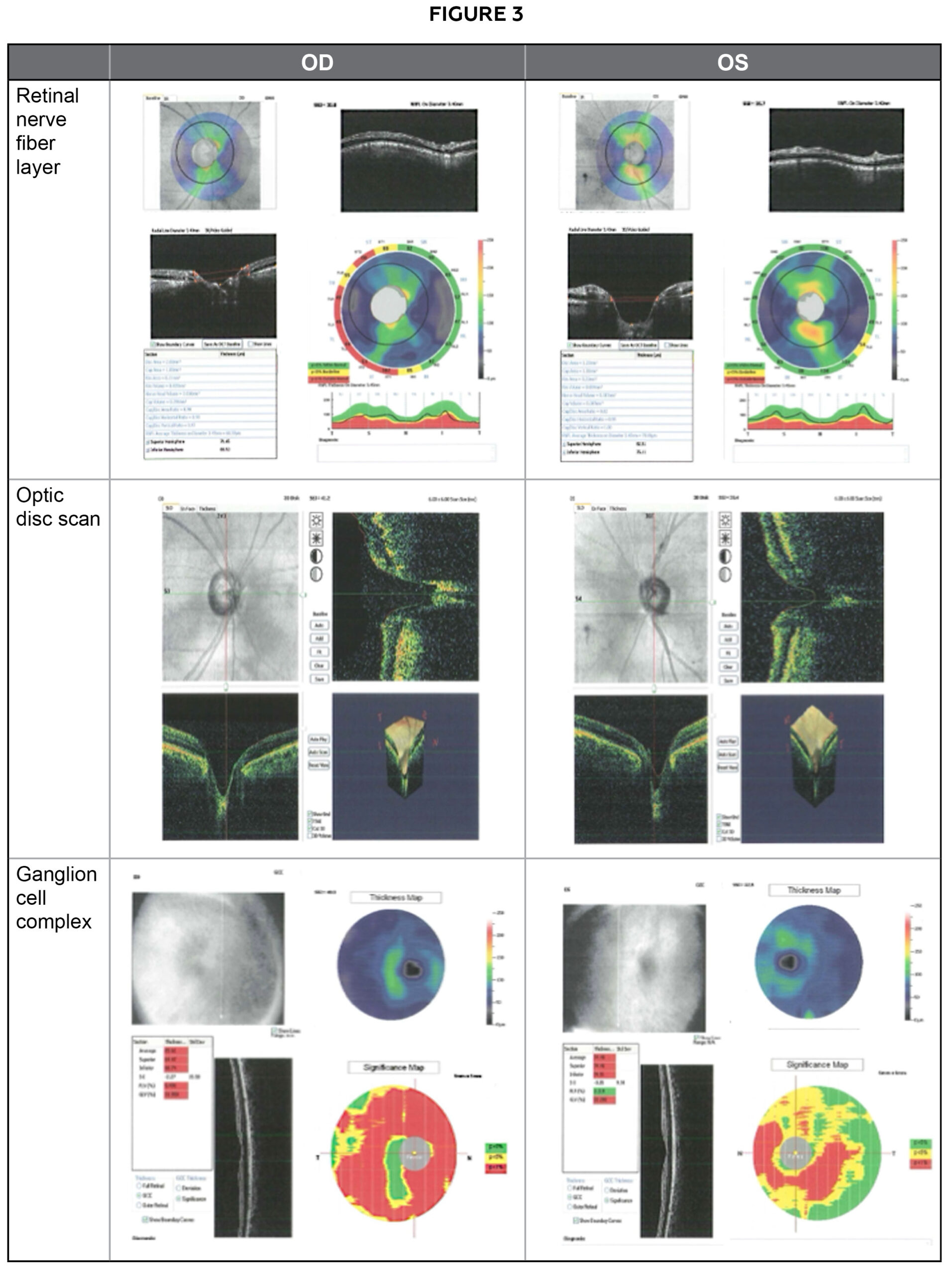 Relative retinal nerve fiber layer rim thinning was noted inferiorly and superiorly in the right eye and possibly inferiorly in the left eye with average retinal nerve fiber layer (RNFL) thicknesses of 68.59 µm in the right eye and 78.81 µm in the left eye. Asymmetric optic disc sizes in the right eye are greater than in the left eye were quantified, and the ganglion cell complex maps demonstrated thinning inferiorly and superiorly in the right eye and inferiorly in the left eye with average thicknesses of 65.61 µm in the right eye and 74.48 µm in the left eye. These findings were consistent with his optic nerve head appearance and visual field defects. Figure 3 provides the retinal nerve fiber layer, optic disc scan and both the thickness of the ganglion cell complex maps and significance map.