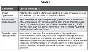 Based on the presence of bilateral elevated intraocular pressure reading in a patient without acute ocular symptoms such as pain, the following differential diagnoses were considered as listed in Table 1, ranked starting with more likely.