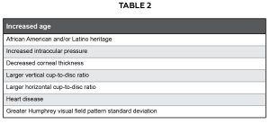 Bilateral elevated intraocular pressures in a patient without acute ocular symptoms can also be due to secondary open-angle glaucoma, such as pseudoexfoliation (or exfoliation) and pigmentary glaucoma. Signs of pseudoexfoliation glaucoma include: iris transillumination defects, exfoliative material on the lens capsule and/or on the iris, anterior hyaloid, or zonules, and increased, oftentimes patchy, pigment deposit on the trabecular meshwork and at Schwalbe line with gonioscopy.12 Signs of pigmentary dispersion glaucoma include: pigment on the corneal endothelium (Krukenberg spindle), mid-peripheral iris transillumination defects, and significant gonioscopy findings including increased homogenous pigment in the trabecular meshwork and/or irregular pigment deposit on the trabecular meshwork, particularly inferiorly, anterior to Schwalbe line (Sampaolesi line).13 It is important to mention that patients with dark irides may occasionally have pigment on or slightly above Schwalbe’s line and not have glaucoma. Furthermore, patients with either pigmentary dispersion or pseudoexfoliation glaucoma must demonstrate a characteristic optic nerve head appearance and corresponding visual field defects consistent with glaucoma. If such findings are not found, the patient is considered not to have glaucoma but may remain a glaucoma suspect.