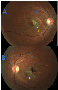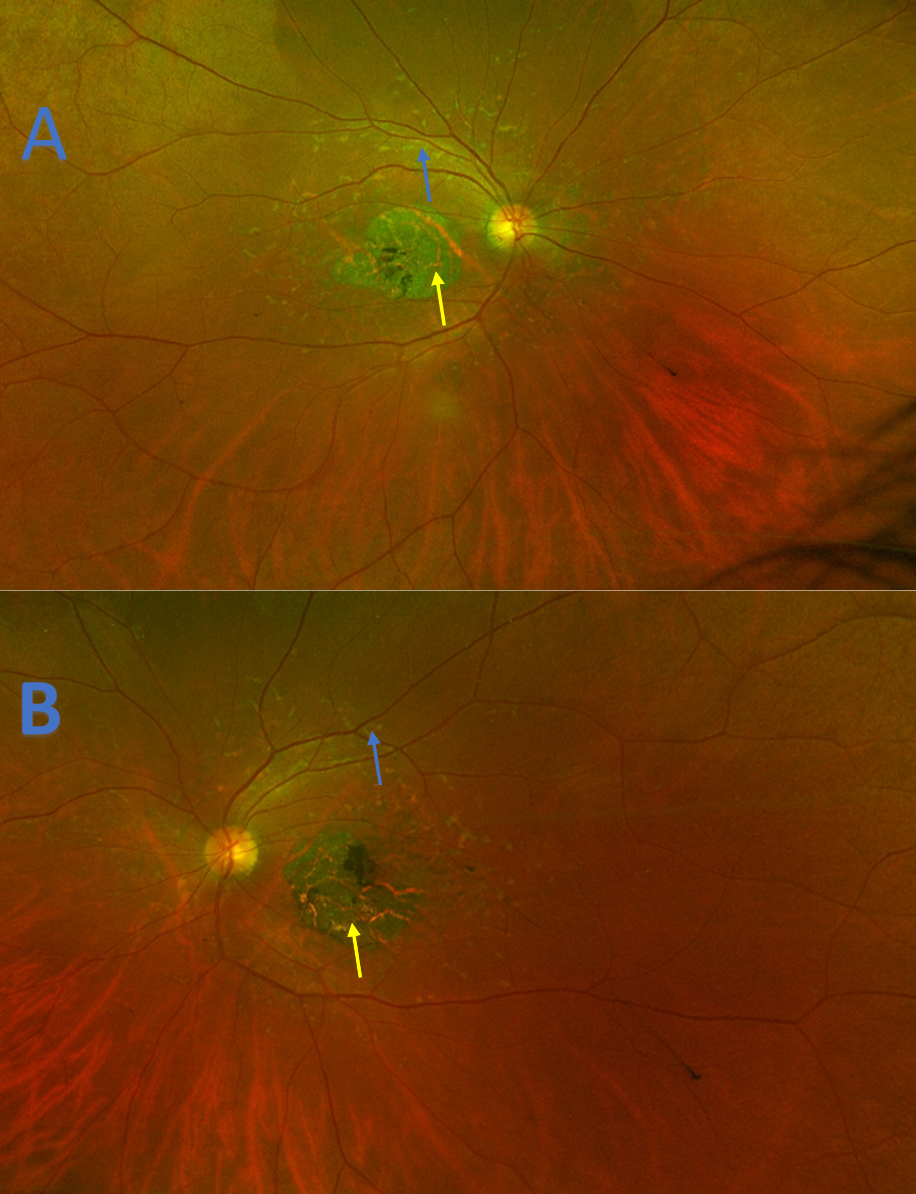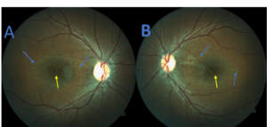 Figure 1. Fundus photographs of the right (A) and left (B) eye of patient 1 demonstrating macular atrophy (yellow arrows) with surrounding pisciform fleck accumulation (blue arrows).