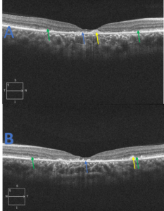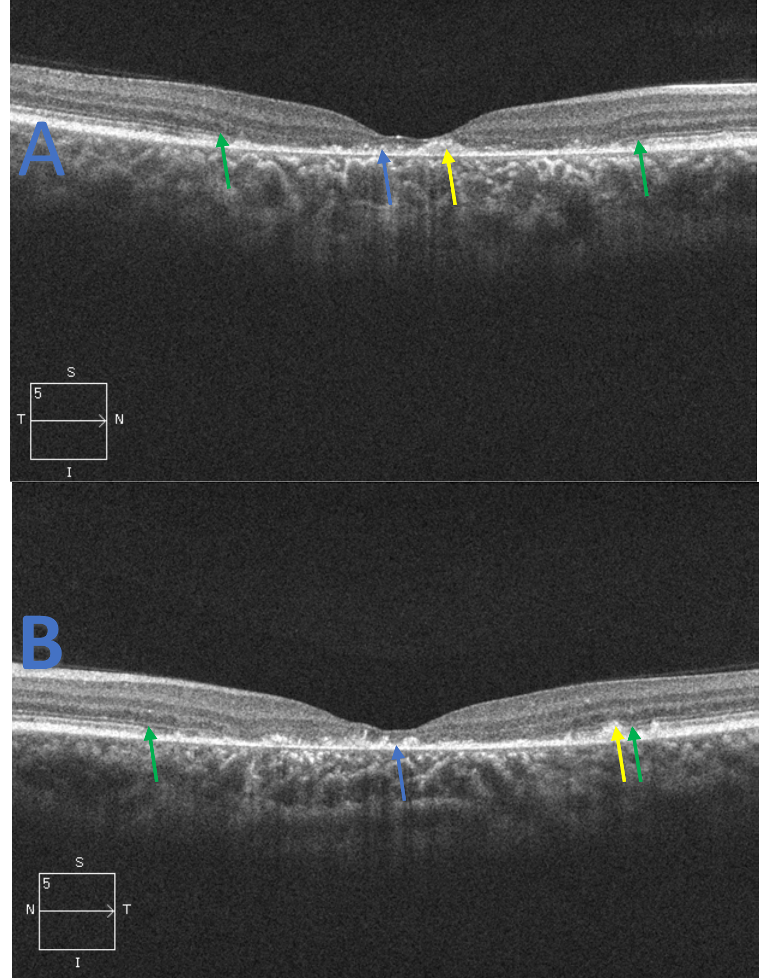 Figure 5. Spectral domain optical coherence tomography raster scans of the macula from the right eye (A) and left eye (B) of patient 2. Scanning reveals retinal pigment epithelium atrophy, more so nasal to the fovea in both eyes (blue arrow), which corresponds to the fundus appearance in Figure 4. Retinal pigment disruption is noted as hyper-reflectivity (yellow arrow). Ellipsoid zone compromise, but not complete atrophy, is noted and corresponds with the patient’s visual acuity. The junction of ellipsoid zone disruption and loss is noted (green arrows).