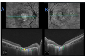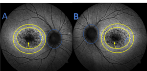 • AMD. AMD tends to present later in life and is characterized by the presence of drusen, which may be confused for lipofuscin flecks, in its dry form and the presence of choroidal neovascular membranes in its wet form. The flecks and drusen can be distinguished with FAF as the flecks will show intense hyper-autofluorescence while the drusen will show little to no autofluorescence.12 Both conditions tend to present with RPE atrophy in their respective late stages; however, this presentation should be evident at an earlier age in STGD1 patients. AMD patients may also have a strong history of smoking and/or exposure to ultraviolet light.