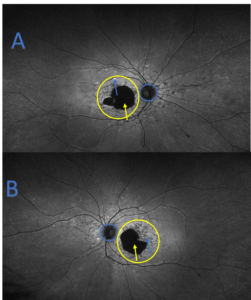 By far the most useful test available to clinicians is FAF. As explained previously, STGD1 is characterized by the accumulation of lipofuscin, which leads to classic findings such as pisciform flecks and RPE atrophy. Lipofuscin has autofluorescent properties and thus FAF can visualize/detect these findings despite the appearance of a normal fundus. Two characteristic findings are seen on FAF: hyper-autofluorescence and hypo-autofluorescence. Hypo-autofluorescence indicates a lack of RPE and thus a lack of lipofuscin, which correlates to RPE atrophy that can be seen in STGD1. Hyper-autofluorescence indicates an excess of lipofuscin in the RPE and thus a diseased or sick RPE. This also correlates to pisciform flecks of various sizes and shapes. Ultimately, the hyper-autofluorescence seen with pisciform flecks and within the RPE will transition to hypo-autofluorescence as the flecks and lipofuscin are reabsorbed leading to RPE atrophy. Other findings are also present with FAF. One finding that can be seen in patients is a hyper-autofluorescent border surrounding RPE atrophy/hypo-autofluorescence. This is thought to indicate possible disease progression in terms of RPE atrophy. FAF patterns have also been classified into subtypes based on the degree of atrophy. Subtype 1 is thought to represent the mildest form with slower rates of progression while the last subtype, 3, is associated with more rapid progression.16 Lastly, peripapillary sparing is more evident and obvious with FAF when compared to fundus examination/photography.2 These FAF findings were apparent in both patients as they presented with central hypo-autofluorescence, surrounding hyper-autofluorescent flecks, a hyper-autoflourescent border around the hypo-autofluorescence, and peripapillary sparing (Figure 7). Clinicians should perform baseline FAF in all patients that have or are suspected of having STGD1 based on the findings above. Baseline FAF should also be considered in family members if history or examination findings suggest possible familial involvement.