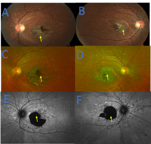 Figure 8. Montage progression images of the right eye (B, D, F) and left eye (A, C, E) for patient 2. Visit one (baseline) fundus images (A, B) show macular atrophy with compromise of the fovea (yellow arrows). Visit two fundus imaging (C, D) shows expansion of the macular atrophy with adjacent retinal pigment epithelium hyperplasia (yellow arrows) that now involves the fovea. This corresponds to the decrease in the patient’s visual acuity from visit one. Fundus autofluorescence (E, F) further highlights the macular atrophy from visit two as evident by the large amounts of hypo-autofluorescence (yellow arrows). Click to enlarge
