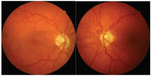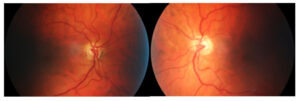Case 1: Both optic nerves have a symmetrical appearance with the central artery being displaced superiorly, a partial peripapillary halo with no distinct pallor. (Image 1)