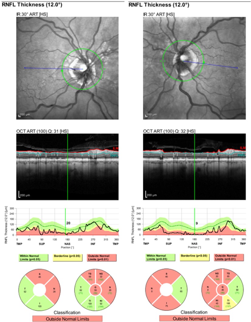 Image 2. RNFL OCT of the right (a) and left (b) eye of Patient 1. Click to enlarge