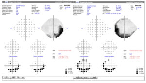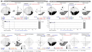 Imaage 3. HVF testing 24-2 SITA Standard of the right and left eye for Patient 1. Click to enlarge