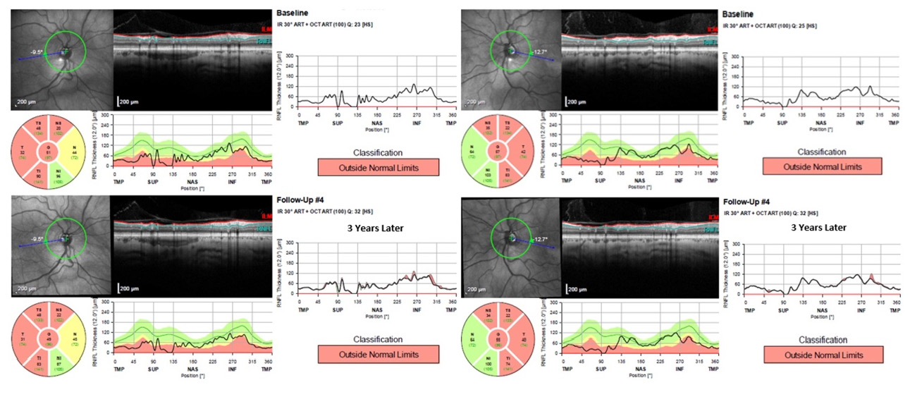 Image 5. Baseline RNFL OCT and a 3-year follow-up of the right (a) and left (b) eye of Patient 2. Click to enlarge