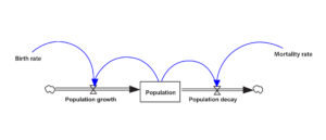 System dynamics models in Vensim are based on three elements: stocks, flows and feedback loops. Stocks are variables that accumulate over time, such as “population” in Figure 1. Flows can increase or decrease stocks, as in the case of “population growth” (which increases “population”) and “population decay” (which decreases “population”) in Figure 1. Feedback loops can be reinforcing (promoting growth or decay) or balancing (promoting the achievement of the desired state).