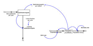This paper has shown an application of system dynamics to model the optometric and ophthalmologic workforce in the Dominican Republic. The model produces predictions of the changes in the supply of eyecare professionals under varying annual attrition rates. These predictions allow for useful recommendations to be made regarding optometric legislation to curb empiricism, future expansion of the scope of the profession, changes in the number of admitted optometry students, and changes in the number of ophthalmology residents. Optometric educators could apply system dynamics simulation in their public health courses in diverse areas. For example, it could be used to model demographic changes, the development of epidemics, the effects of air pollution, the provision of immunization services, or workforce needs as in the present case.14-19
