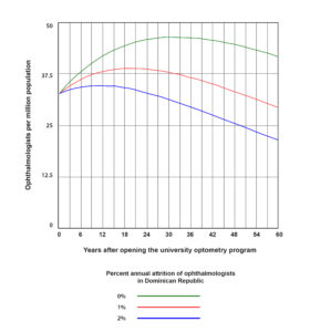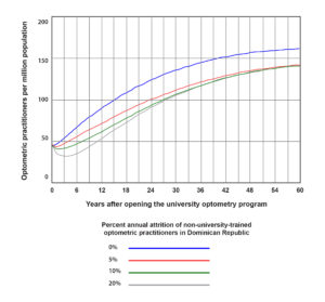 Third, it is assumed there is no attrition of university-trained optometrists during the 60-year period. In the United States, where the profession is mature and well-established, approximately 2% of optometrists retire annually.42 When assuming a cohort of young graduates in the Dominican Republic (less than 25 years old), one can expect low percentages of retirees during the first 40 years. On the other hand, when assuming a cohort of older students entering the program, one may expect a higher percentage of annual retirees. Future data on the student body composition may allow for better refinement of the optometric workforce model.