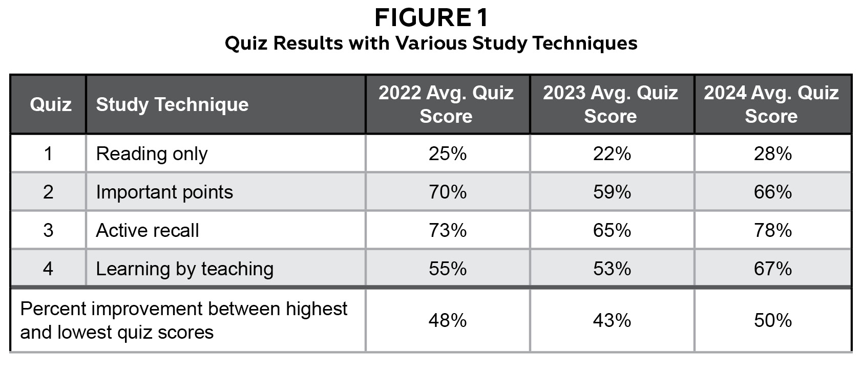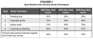 Students read four short excerpts from optometric textbooks, employ one of the study techniques that are discussed, then take a brief quiz to evaluate how well that study strategy worked for them. With the first reading, the students read the passage once, then complete the quiz. Unsurprisingly, this approach has always resulted in the worst quiz outcomes. With the second reading, students are instructed to stop after each subsection in the passage and write down the one or two most important points, then write down what is still confusing at the end of the excerpt. With the third reading, they practice active recall and self-testing. With the fourth reading, students practice learning by teaching. They read the full passage, then pair up with another student and take turns explaining the material to each other before completing the final quiz. All quizzes are completed on Canvas, and results are shared with the students immediately. The quiz scores from all four study strategies are shown in Figure 1. As evidenced by the quiz scores, students retain material much better when using one of the active learning techniques.