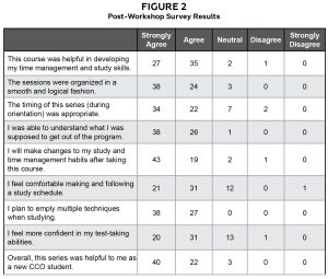 Students were also asked to evaluate the workshop series itself. Ninety-five percent of students felt the sessions were organized in a smooth and logical fashion, 86% felt it was appropriate to hold these workshops during orientation, and 98% agreed that they were able to understand what they were supposed to get out of the program. Ninety-five percent of respondents agreed or strongly agreed with the statement “Overall, this series was helpful to me as a new CCO student.” The full responses to these survey questions can be found in Figure 2.