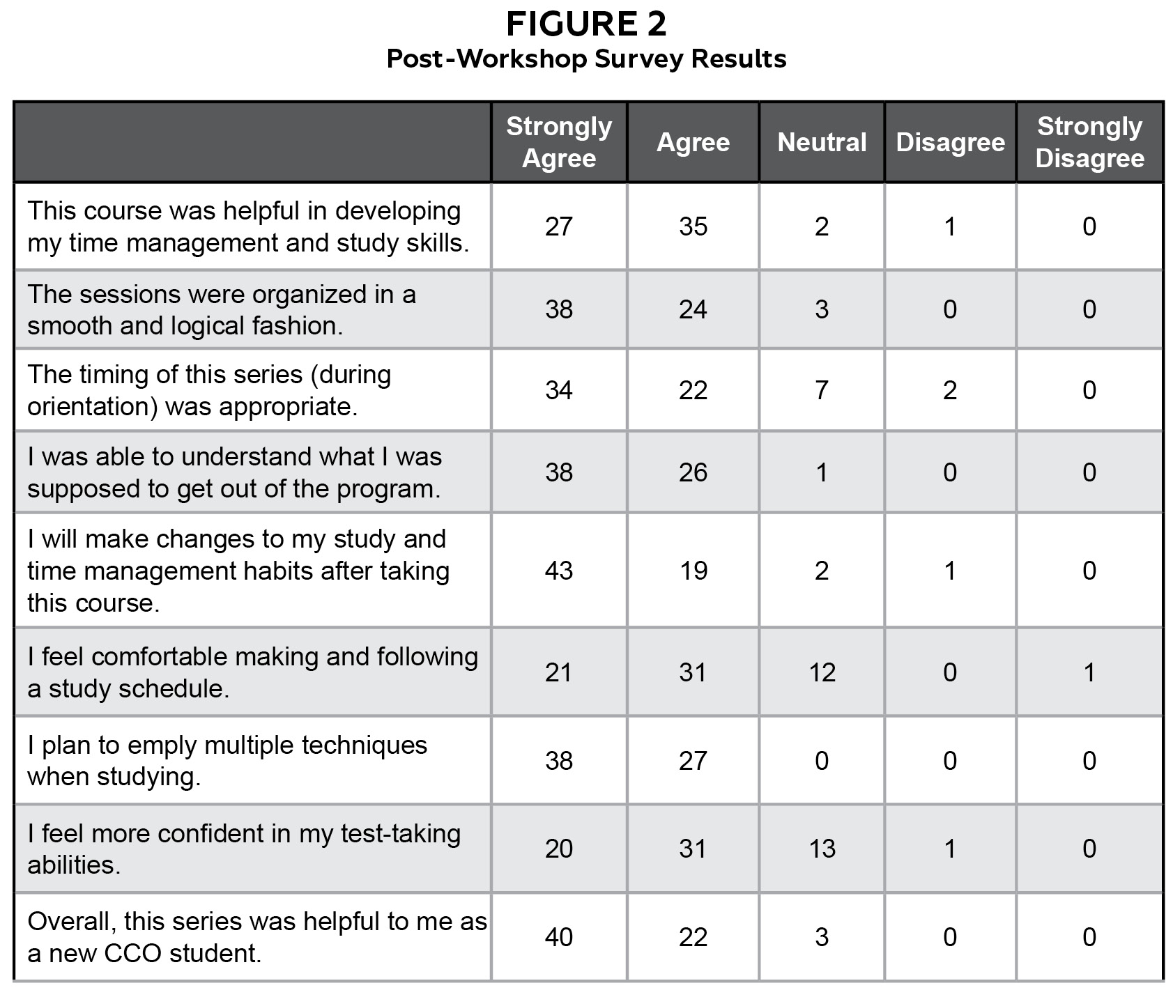 The Study and Time Management Strategies workshop series was designed with these research results in mind, and was presented as an interactive, engaging three-part series that highlights best practices in study skills to assist students as they begin their time in optometry school. The purpose of this publication is to outline the program and students’ feedback on its format, timing and effectiveness.