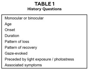 Disease at any level in the visual pathway can result in temporary vision loss. However, disease to structures that refract light such as the cornea and ocular media typically do not result in complete loss of vision as light can still stimulate the retina. Disease to the retina, optic nerves, optic radiations or visual cortex can cause more explicit vision loss. This overt TVL most often stems from transient vascular compromise to the eye or afferent visual pathway in the brain. A disruption in blood flow to the retina or occipital lobe, from ischemia or vascular insufficiency whether hemodynamic or embolic, can result in a dark curtain of vision loss in one or both eyes lasting up to 30 minutes.3 Perfusion of the optic nerve and retina are also dependent on intracranial pressure. When intracranial pressure is increased, as in papilledema, simultaneous transient monocular or binocular vision obscurations that last less than 10 seconds can occur.4 To assist in finding the etiology of TVL, Table 1 highlights important questions to ask when gathering the ocular history. Staff may find it helpful for phone triaging. Table 2 focuses on the TVL-associated symptoms serving to further refine the differential diagnosis.